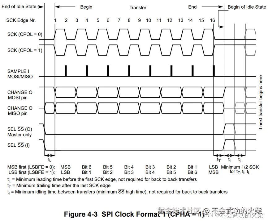 从如下图中看到,同样,当CPOL(时钟极性控制)为0时,IDLE(空闲)状态,时钟保持为0,当CPOL(时钟极性控制)为1时,IDLE(空闲)状态,时钟保持为1。 SCK第一个边沿前tL个时钟周期拉低SS(片选)信号,在第一个时钟沿时发送第一个数据,从图中可以看出,发送数据在第1、3、5、7、9、11、13、15个时钟边沿时,即奇数沿;采样数据在第2、4、6、8、10、12、14、16个时钟边沿时,即偶数沿;数据可以是MSB first(高位在前),也可以LSB first(低位在前),在FPGA实现中一般为高位在前,具体与从设备一致即可。 在发送/采样结束之后,在最后一个SCK沿后再等待tT时间回到IDLE(空闲)状态,IDLE(空闲)状态至少保持tI 再进行下一次传输。 从图中看出:tL、tT、tI最少保持二分之一个时钟周期。
