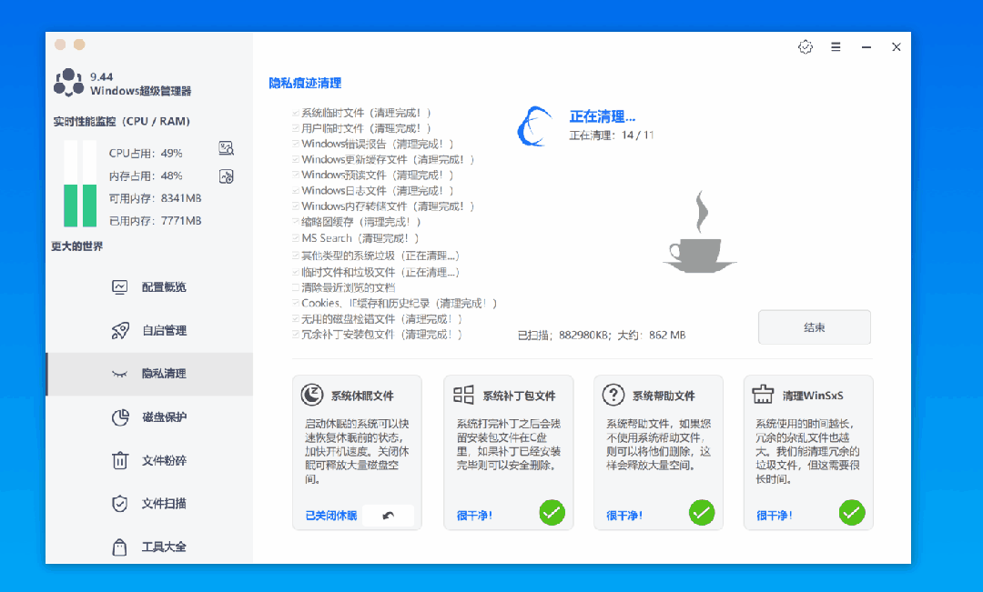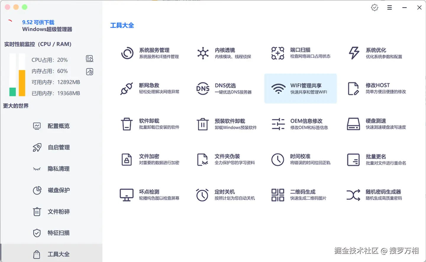 Windows超级管理器官方版是一款多功能的系统管理工具。Windows超级管理器最新版拥有全面的系统检测功能,可以帮助用户了解电脑的显卡、CPU、硬盘、主板、处理器、内存条等配置信息。通过Windows超级管理器用户还可以进行文件清理操作,有效地提高了电脑的运行速度。