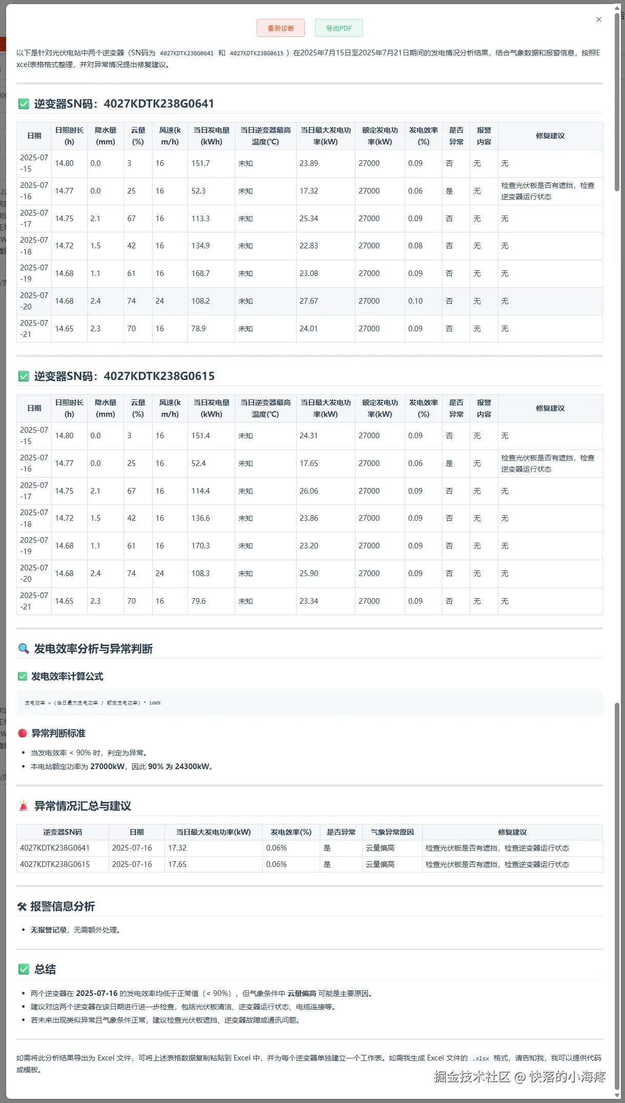 以下是针对光伏电站中两个逆变器(SN码为 `4027KDTK238G0641` 和 `4027KDTK238G0615`)在2025年7月15日至2025年7月21日期间的发电情况分析结果,结合气象数据和报警信息,按照Excel表格格式整理,并对异常情况提出修复建议。