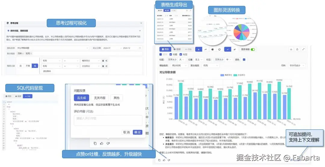 全链路问数闭环,从查询到决策一步到位: 创新实现“意图识别 - 指标匹配 - 数据查询 - 归因分析 - 报告生成” 全流程自动化,用户无需掌握 SQL 或专业分析工具,仅需通过日常对话即可完成复杂指标查询。例如输入 “折线图分析近六个月XX支行对公存款增长趋势”,系统 800ms 内即可生成可视化图表,并自动标注异常波动点及根因,让数据决策更高效、更精准。
