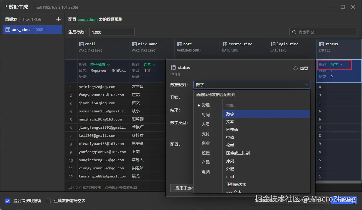 - 我们可以看到SQLark能基于列名、列注释等信息,自动匹配数据生成规则,对于自动生成不太符合的规则,你也可以自行定义,SQLark中内置了多种规则可供选择。
