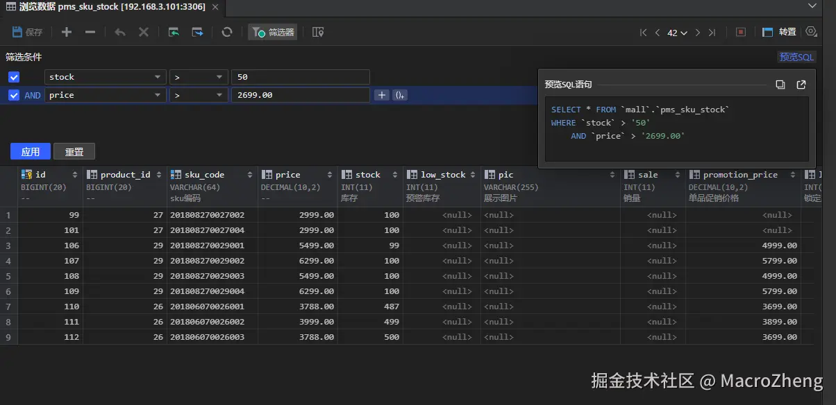 - 支持通过条件对数据进行筛选,并可以生成SQL预览;