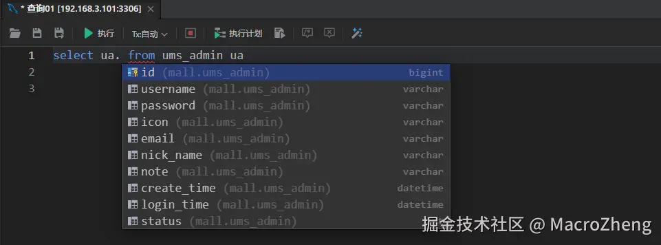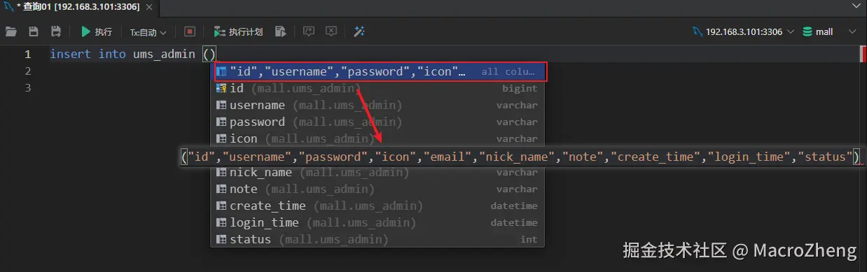 - 智能的SQL补全:支持对SQL中关键词、表名、字段名等的智能补全,能一键完成INSERT语句中所有字段的输入。