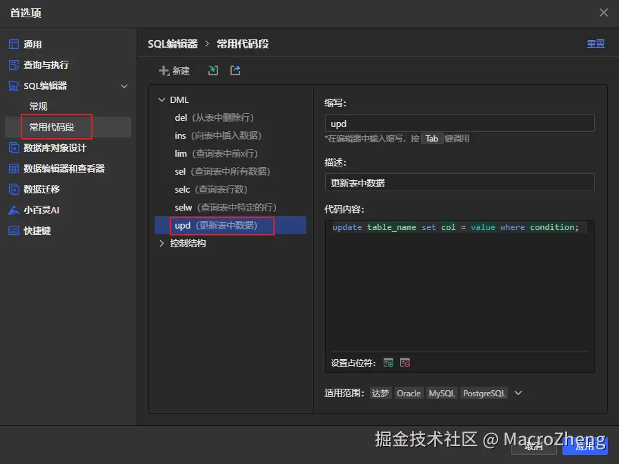 配置->首选项->常用代码段功能中,可以自定义代码模版,例如这里配置的输入upd可以直接生成UPDATE语句;