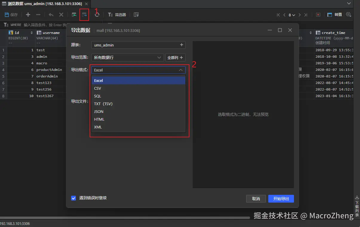 导出按钮,可以将数据库表中的数据导出到外部文件中,支持多种格式的文件;