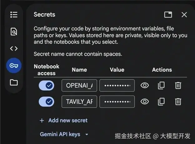 将密钥保存为 OPENAI_API_KEY 和 TAVILY_API_KEY 用于演示,并且不要忘记开启 Notebook 对这些密文的访问权限。
