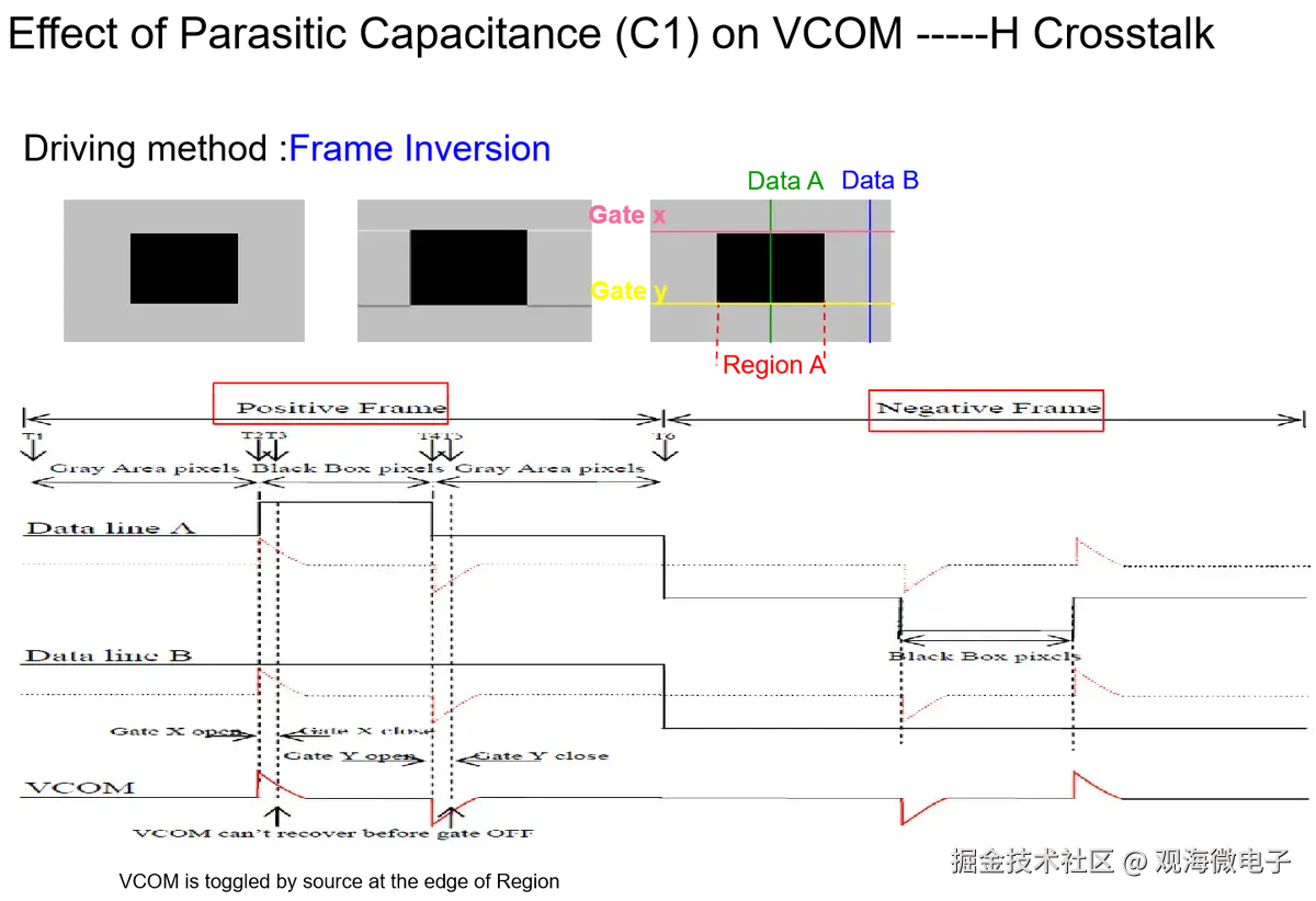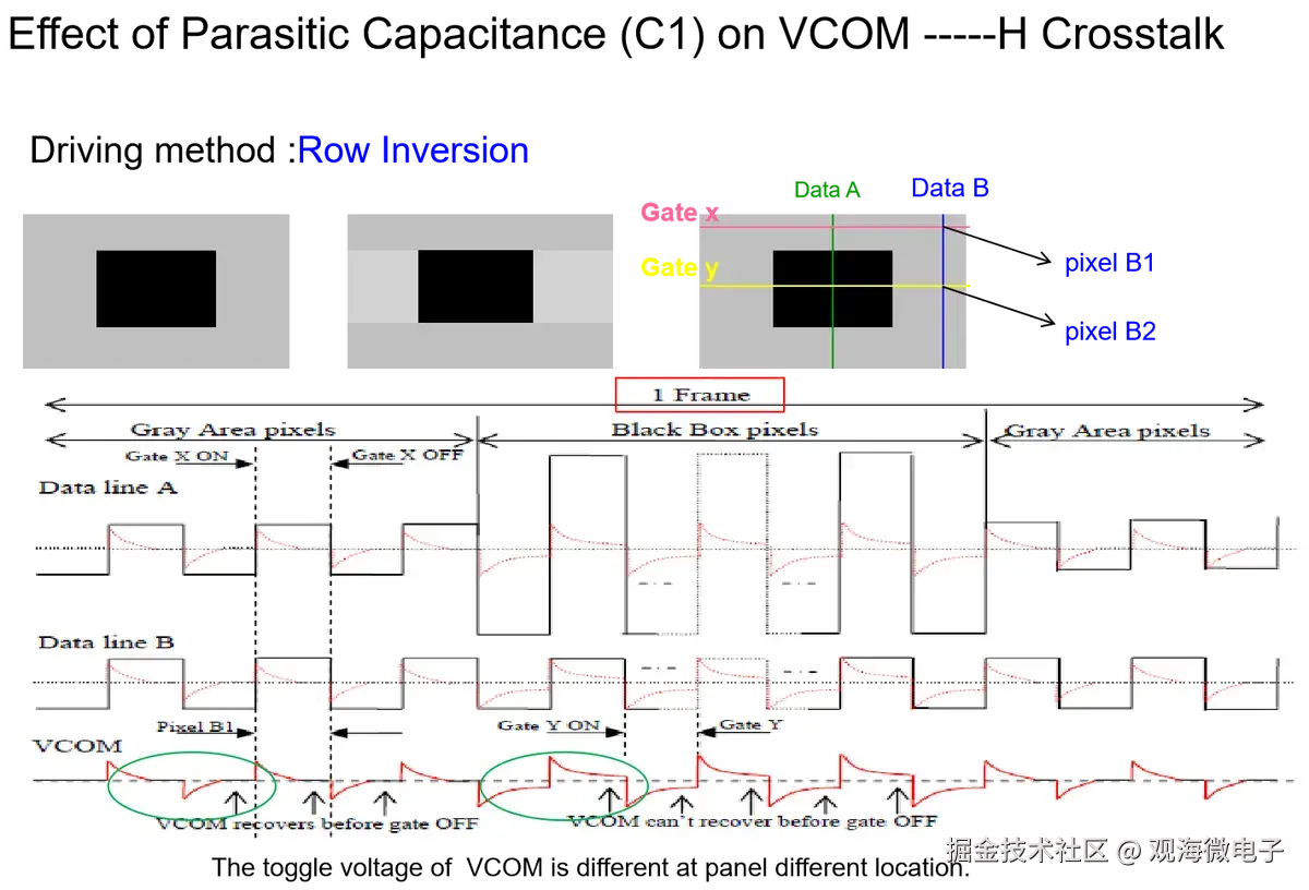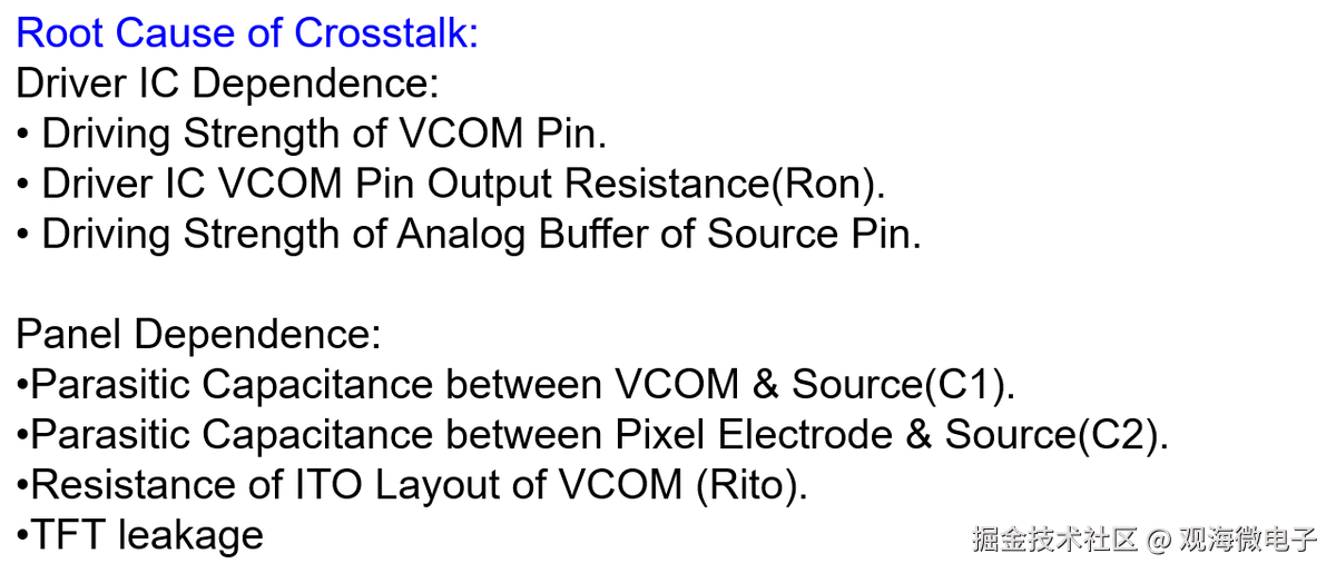 Crosstalk是指在LCD屏幕上,一个区域的图像影响到相邻区域亮度的现象,可分为水平和垂直两种类型。测试通常通过对比128灰阶背景下的黑/白方块来检测。耦合电容在TFT结构中不可避免,影响crosstalk,可通过优化制造工艺来减轻。