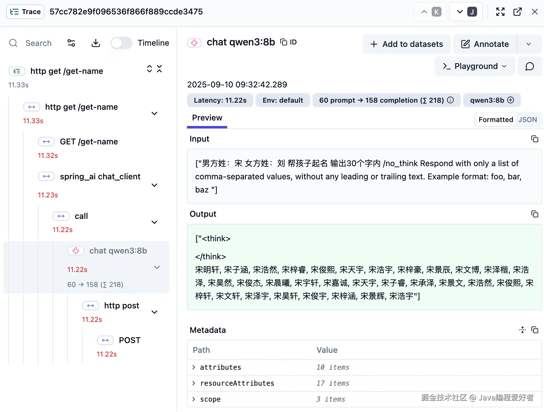 - 监控追踪,LangFuse,追踪大模型应用请求,例如输入输出,耗时、Token消耗等