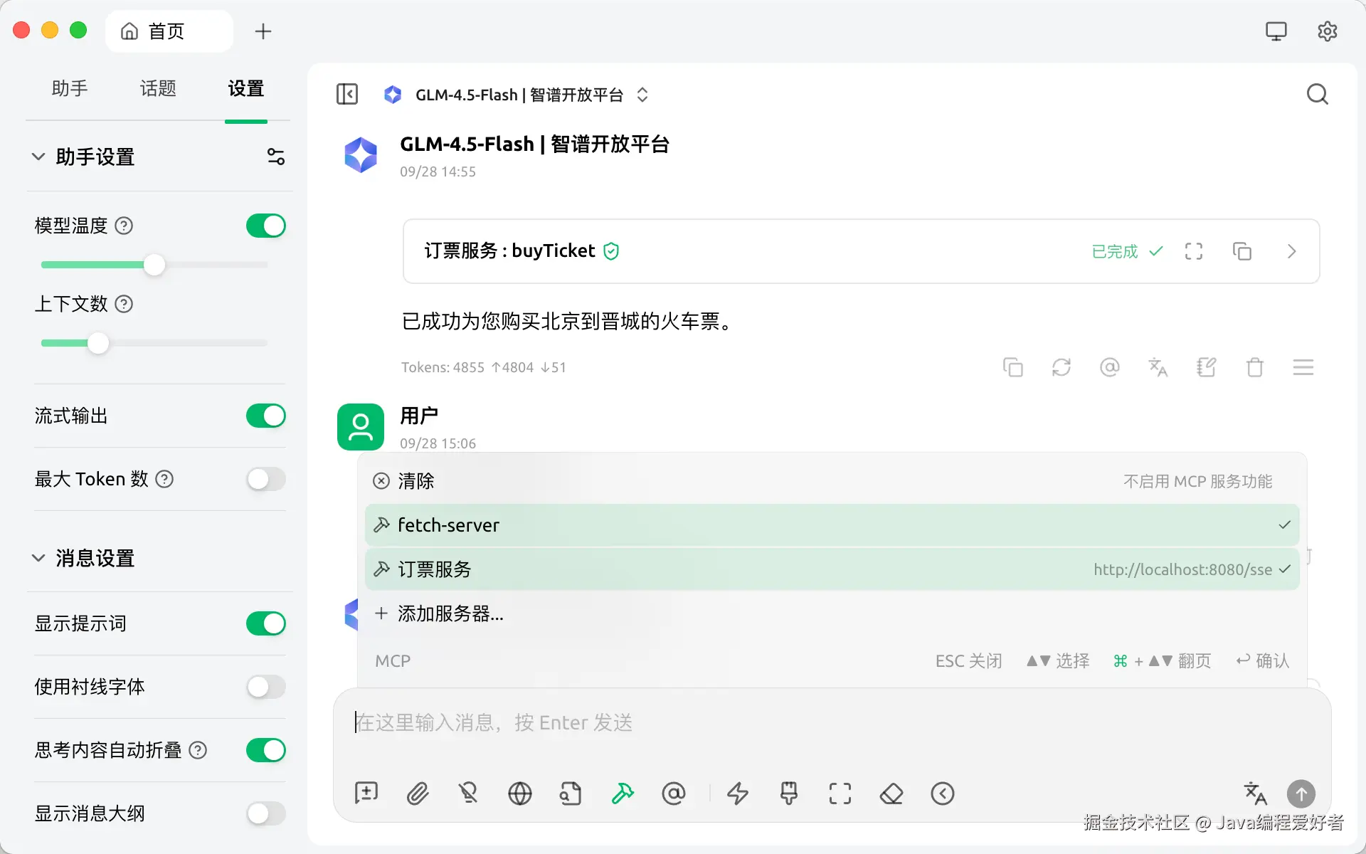 使用和结果,可以看到大模型的思考过程中是使用了mcp服务的