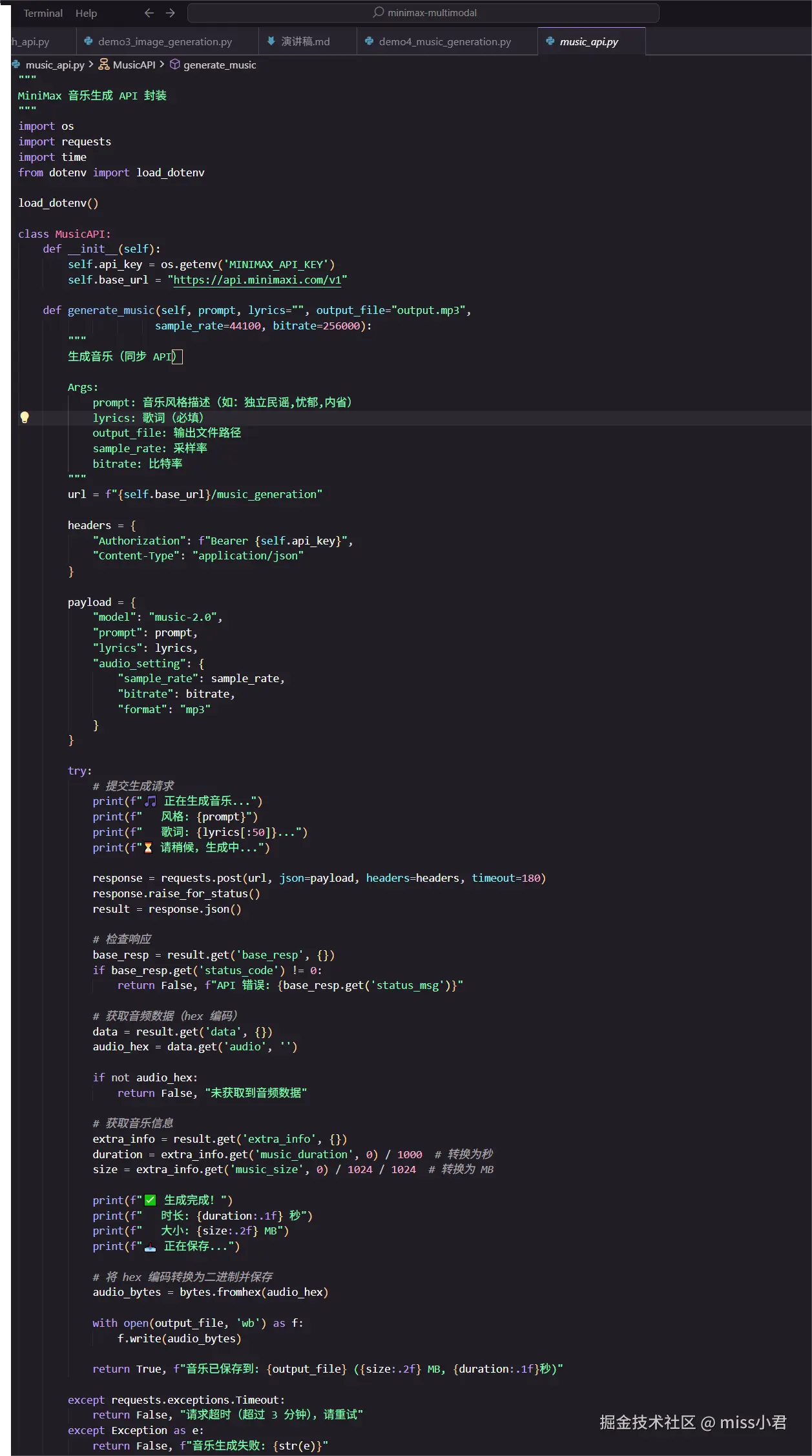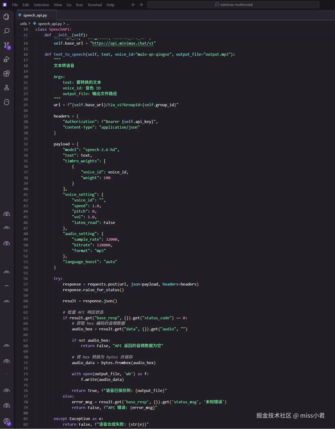 这是API 代码示例,音频的代码也很简单:选择音色,输入文本,就能生成高质量的语音。