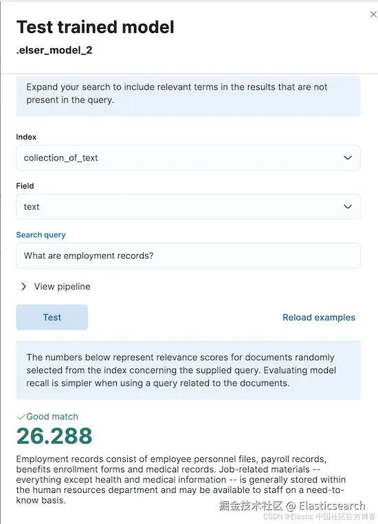 你可以使用现有索引中的数据来测试模型。选择索引,然后选择要在其上测试 ELSER 的字段。输入搜索查询并点击 Test。使用与文档相关的查询可以更方便地评估模型的召回率。