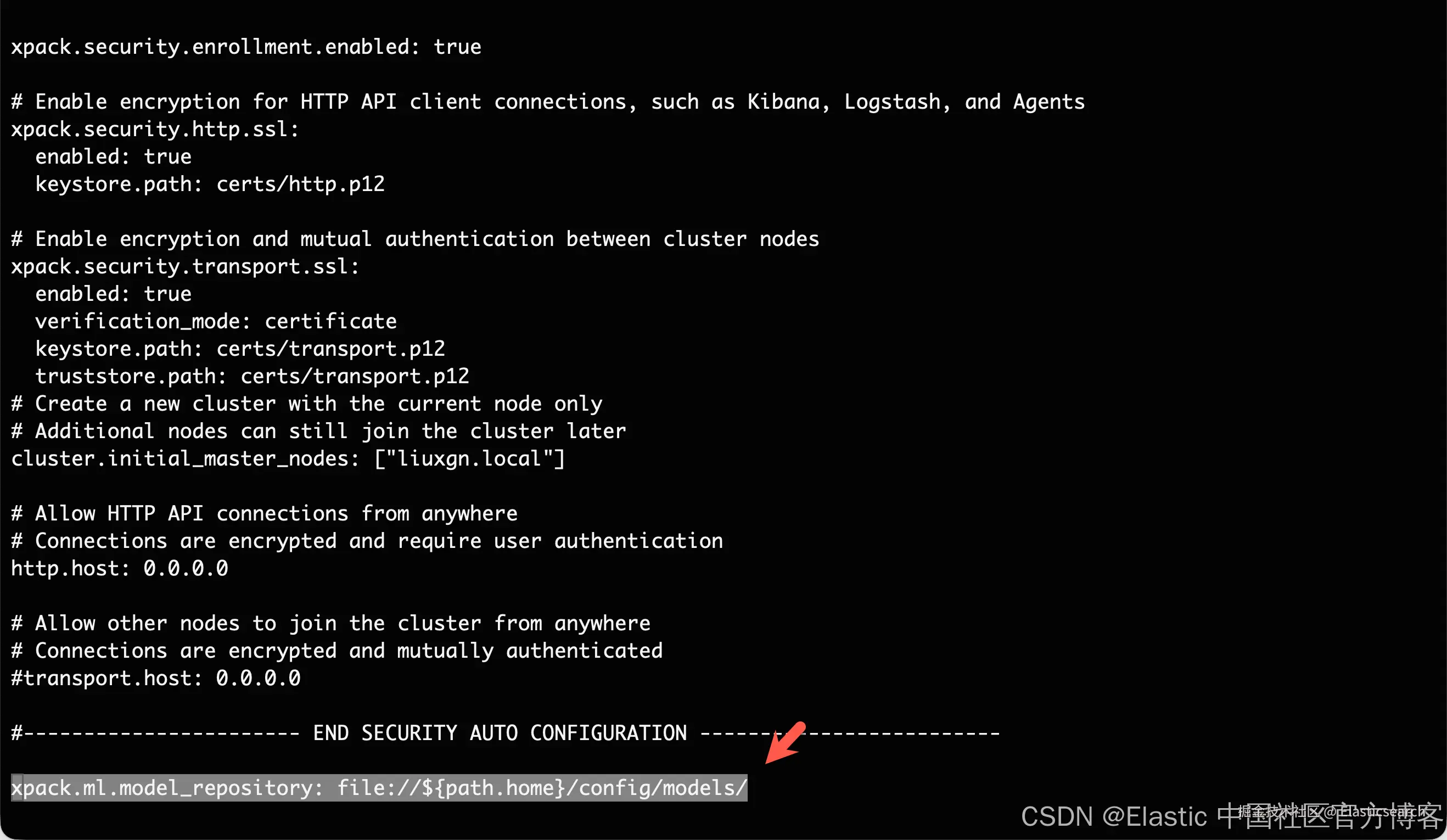 3)在 config/elasticsearch.yml 文件中加入下面这一行,把你的 Elasticsearch 部署指向这个模型目录: