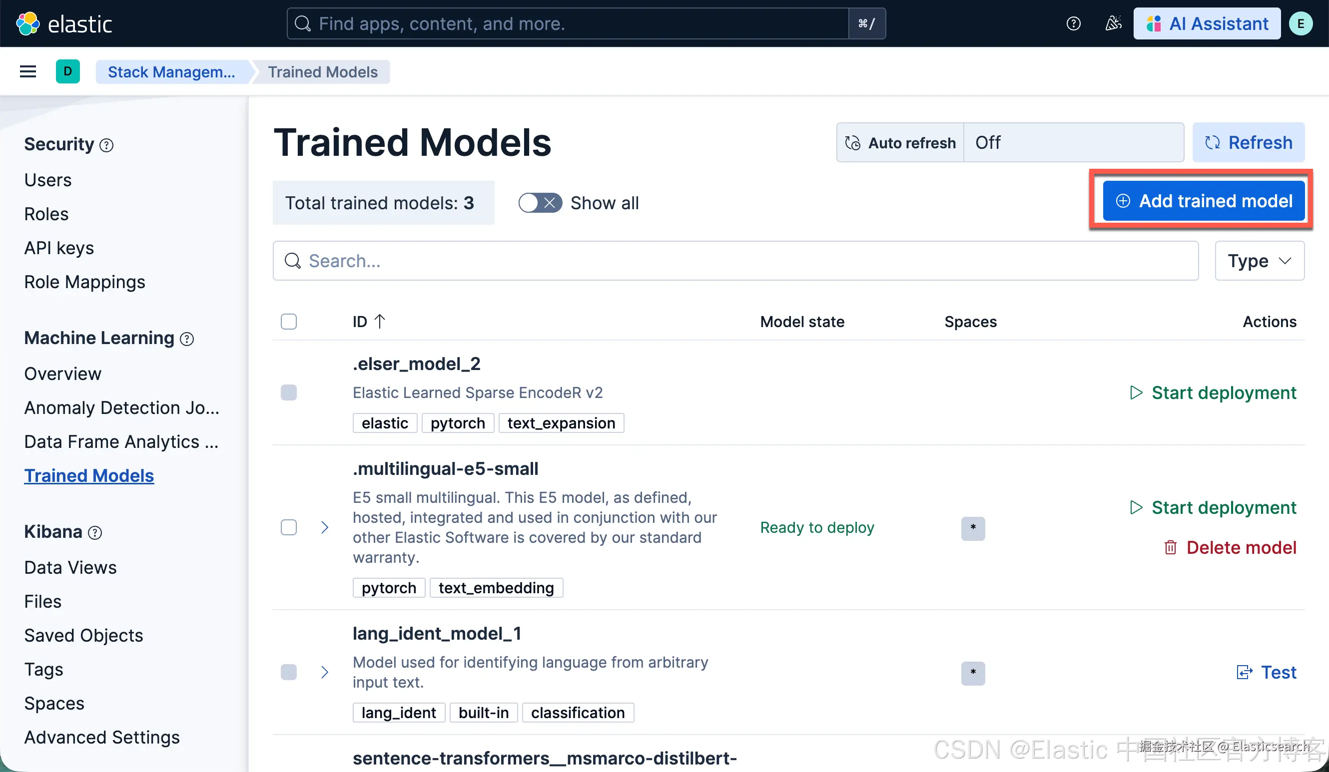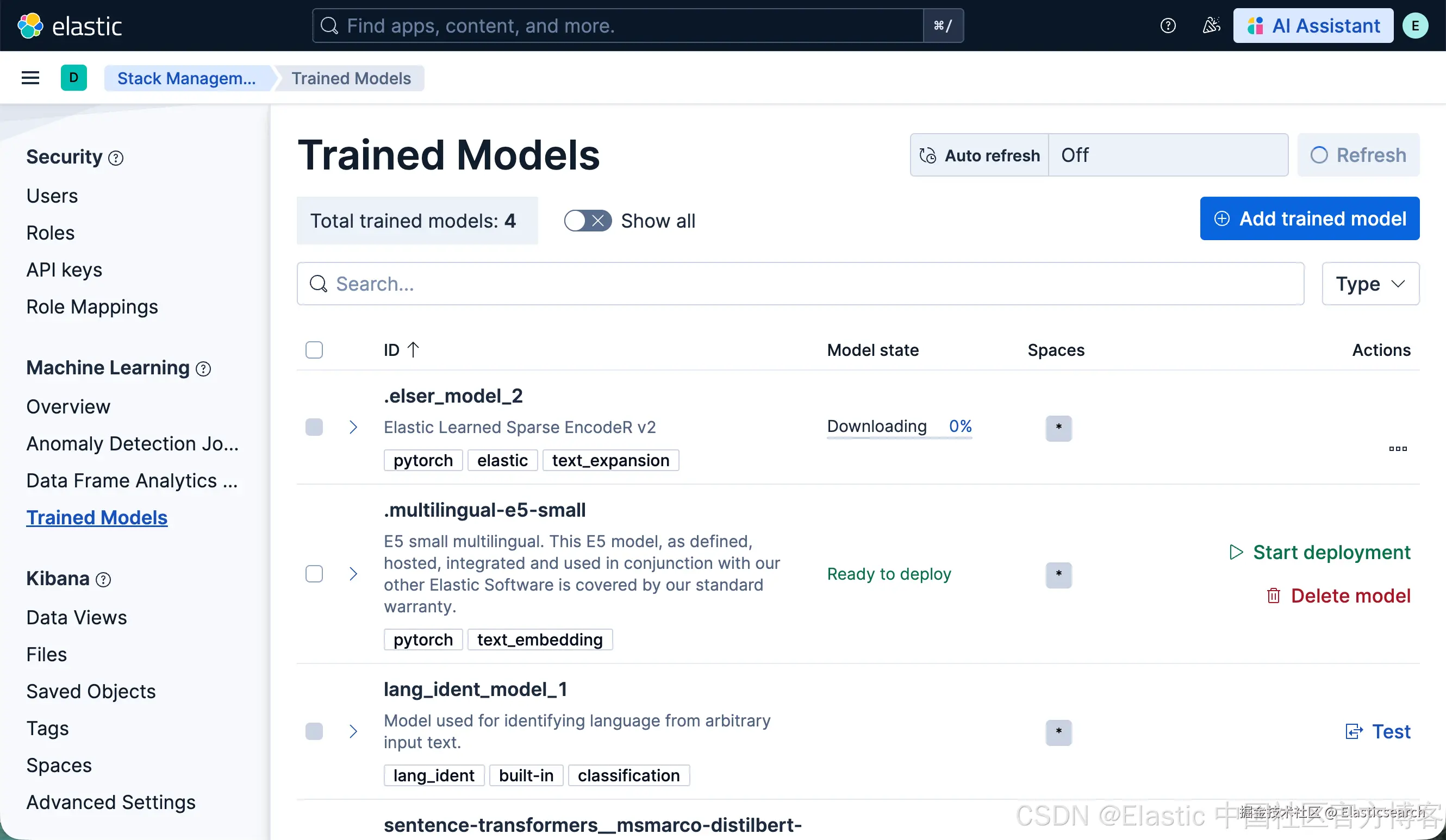 6)在 Kibana 主菜单中进入 Trained Models 页面,或者使用全局搜索。你会在训练模型列表中看到 ELSER。