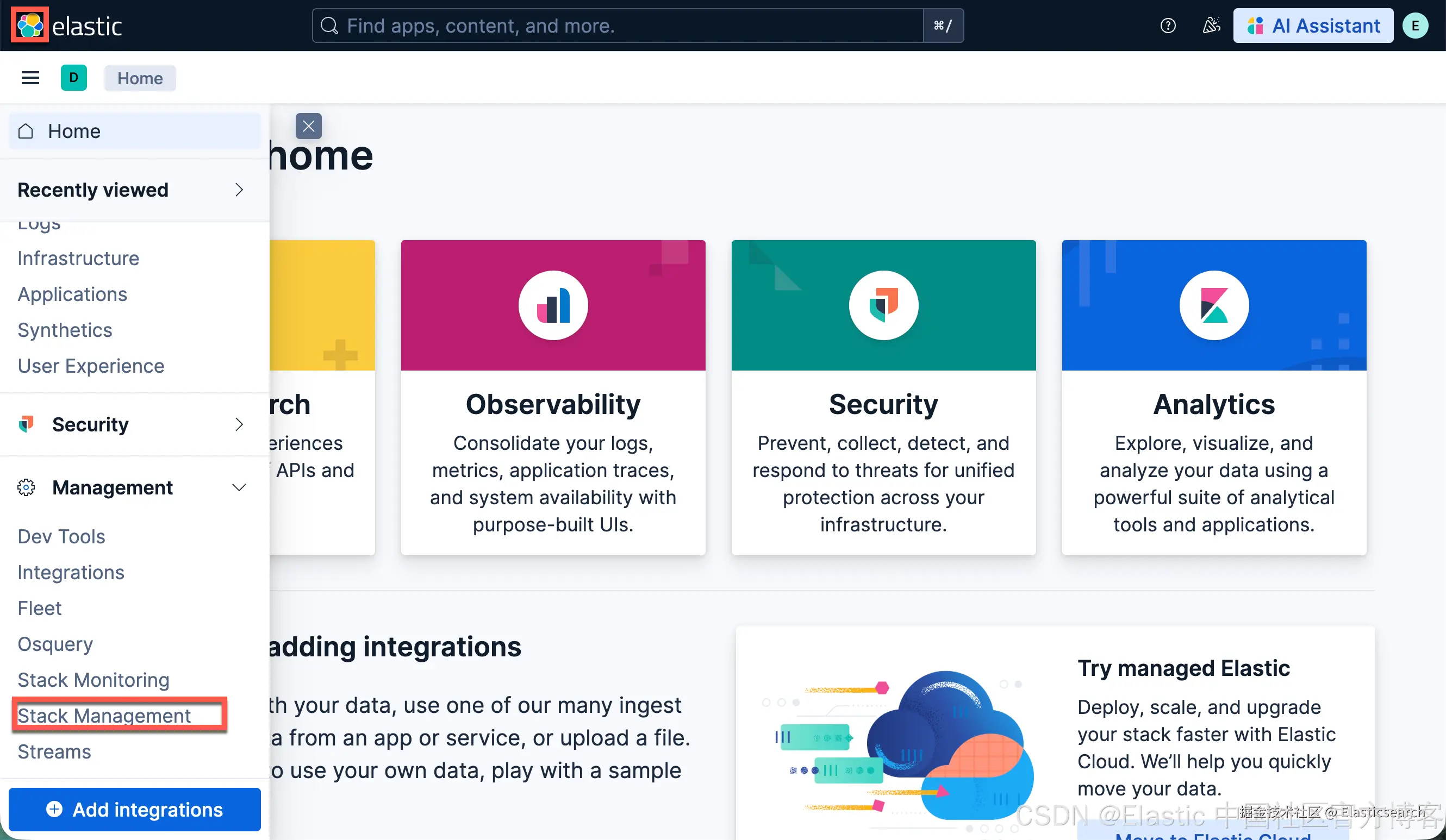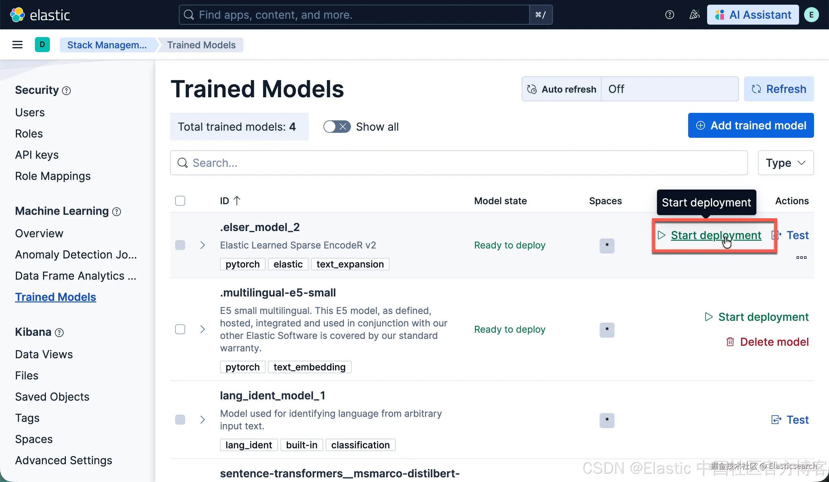 8)在 Kibana 主菜单中进入 Trained Models 页面,或者使用全局搜索。你会在训练模型列表中看到 ELSER。