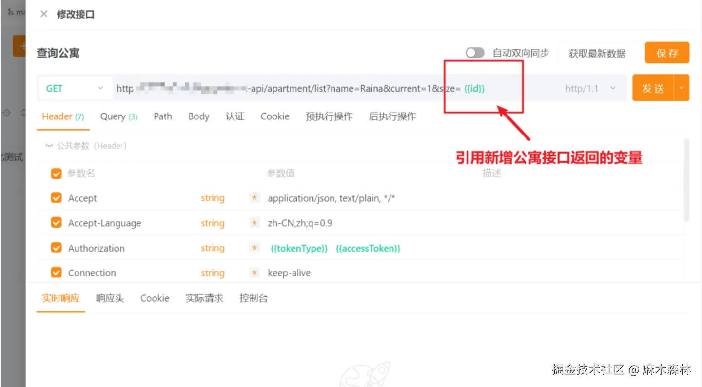 - {id} 是一个变量,它来自于前面新增公寓后返回的id 。