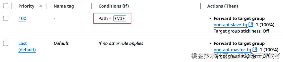 我们可以使用 ALB 监听器规则将 LLM API 请求全部转发到 Slave Target Group, 将所有其他与前端页面操作(主要是管理动作)相关的请求转发到 Master Target Group. 示例如下: