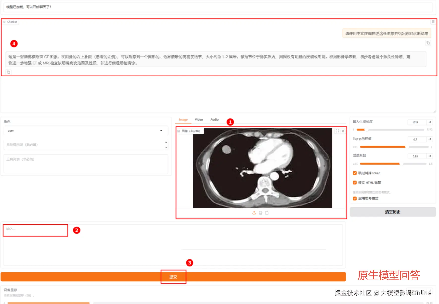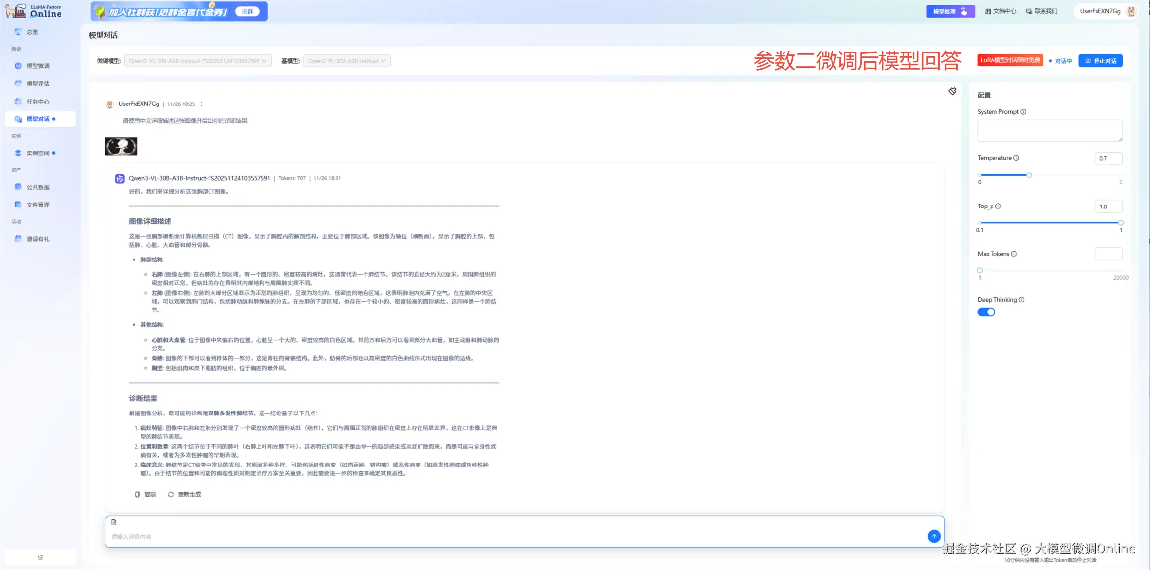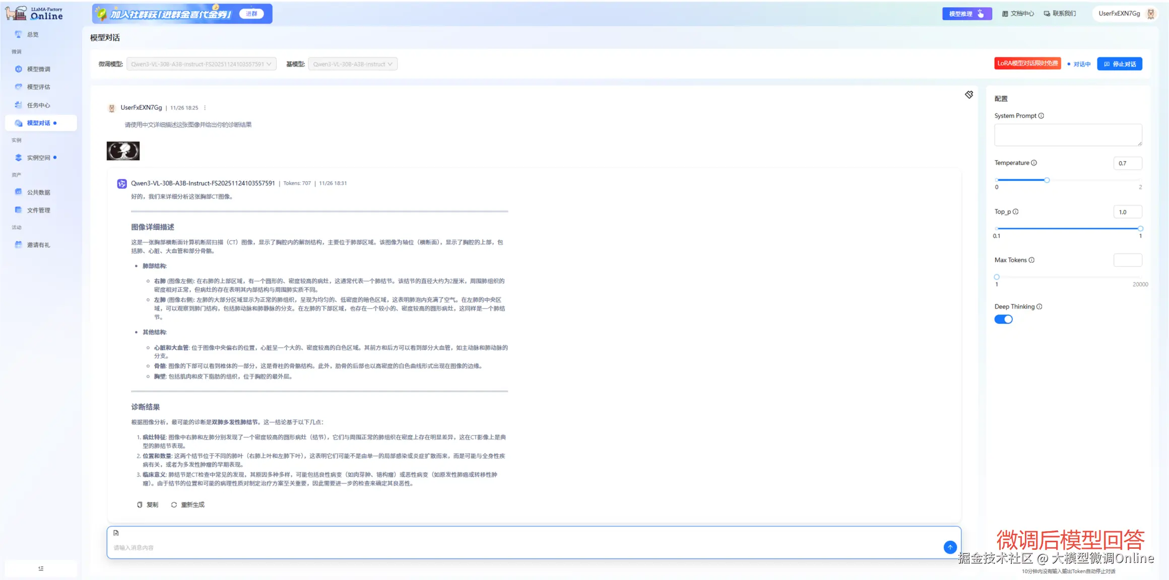 这是微调后模型的回答。它成功化身为“严谨的放射科医生”,不仅准确定位双肺病灶,系统分析肺部结构、心脏大血管和骨骼关系,更能从病灶特征、位置分布和临床意义多个维度进行专业解读,提供完整的鉴别诊断思路,其描述精准、逻辑严密、术语规范,已达到辅助医生进行临床决策的实用水平。
