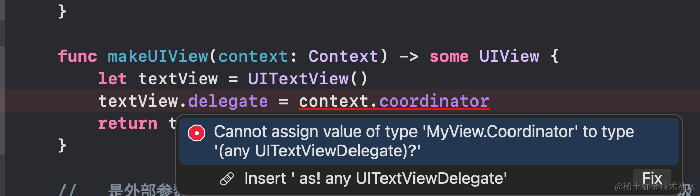 因为你在makeUIView中只是实现了UI,但是没有说这个UI组件当用户输入了内容后,怎么获取里面的值和做什么操作。这个时候,就需要使用 UITextViewDelegate 和 Coordinator 来做了。还有NSObject这个!