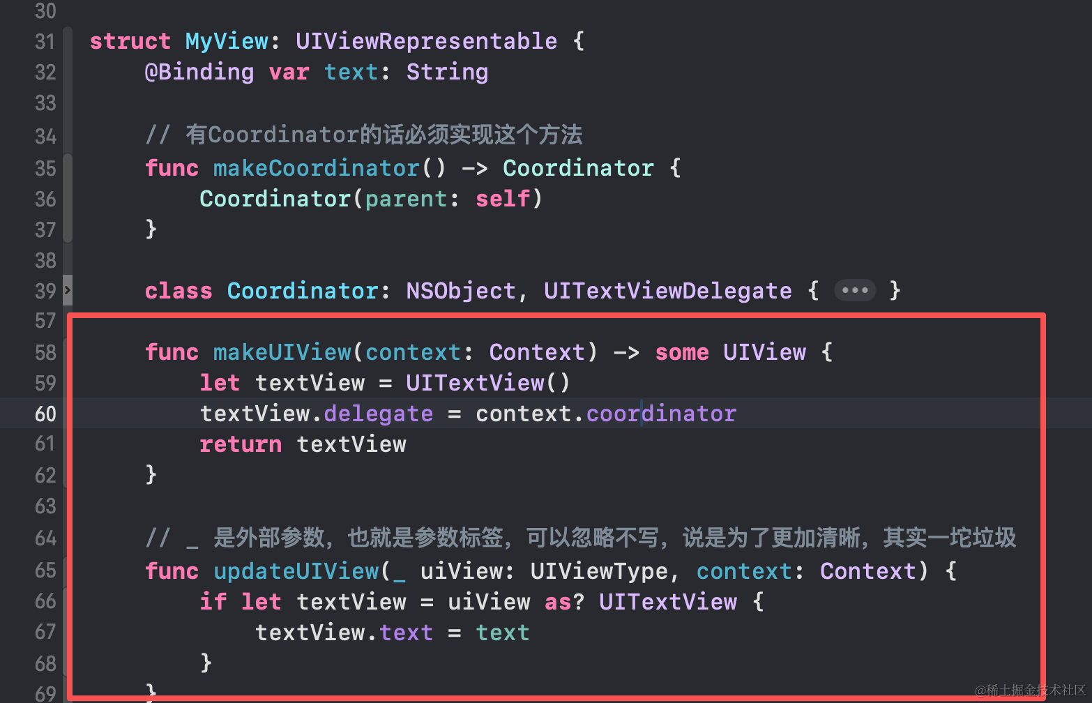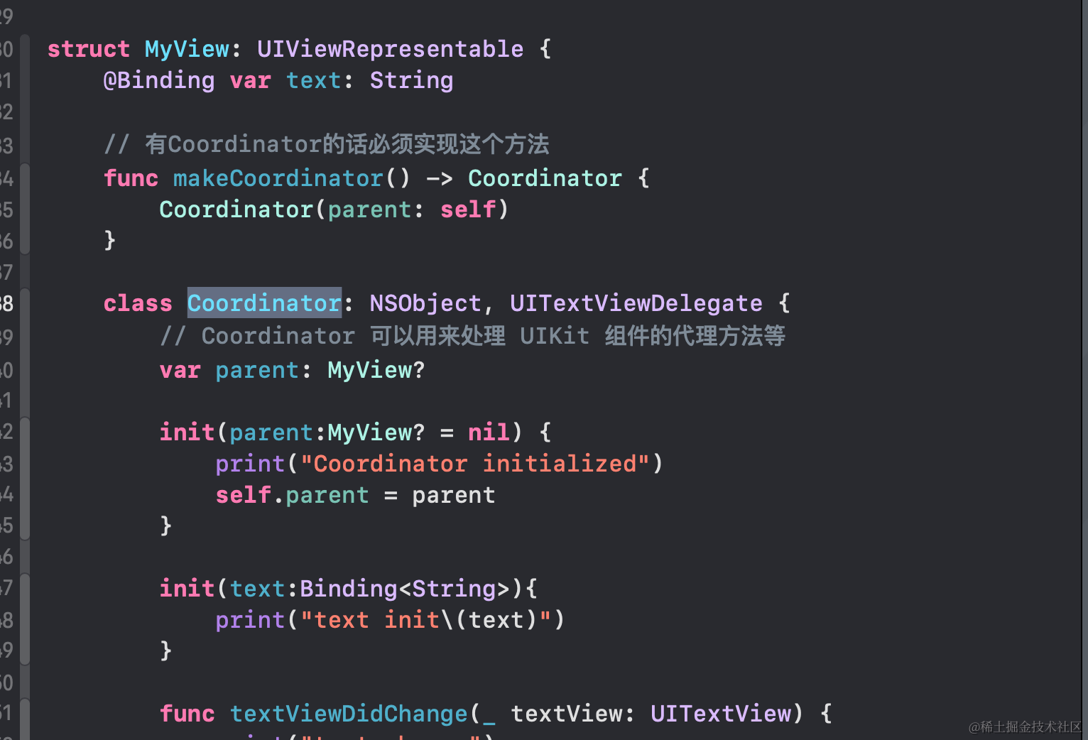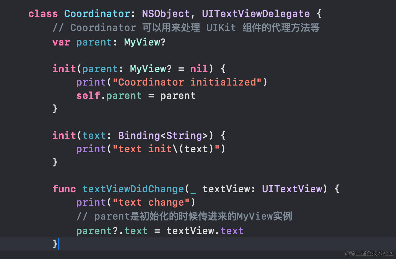 Coordinator是协调器,用于继承 NSObject, UITextViewDelegate然后实现其中的方法,然后作为UITextView的代理,当UITextView文本内容发生变化后,就委托代理里面的方法,比如刚开始输入和已修改等操作函数。