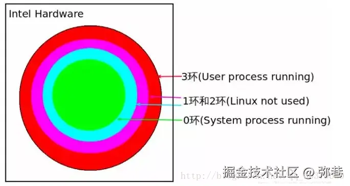 抽象来看,操作系统中安全边界的概念就像环路的概念一样,一个环上持有一个特定的权限组,Intel支持四层环,但是Linux只使用了其中的两层环(0号环持有全部权限,3号环持有最少权限,1号环和2号环未使用),系统进程运行在0号环,用户进程运行在3号环。如果一个用户进程需要其他高级权限,其必须从三号环过渡到0号环,过渡需要通过一个安全参数检查的网关,这种过渡被称为系统调用,在执行过程中会产生一定数量的计算开销。所以,用户空间要访问内核空间唯一的方式就是系统调用。