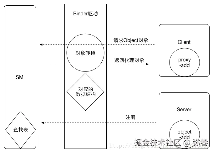 那Client怎么拿到Service中的Binder对象呢?图中可以很清晰的看出整个过程,Client原本从ServiceManager中拿到Binder的引用,通过Binder驱动层的处理之后,返回给Client一个代理对象,实际上如果Client和Service处于同一个进程,返回的就是Binder对象。如果不在同一个进程,返回给Client的就是一个代理对象(proxy)。