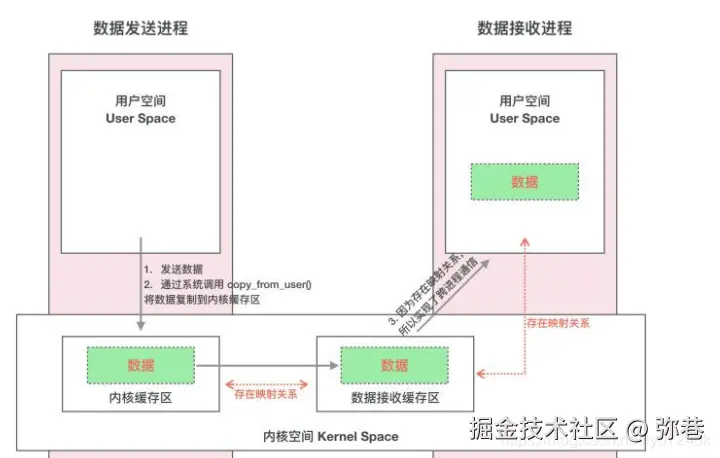 - 发送方进程通过系统调用 copy_from_user() 将数据拷贝到内核中的内核缓存区,由于内核缓存区和接收进程的用户空间存在内存映射,因此也就相当于把数据发送到了接收进程的用户空间,这样便完成了一次进程间的通信。