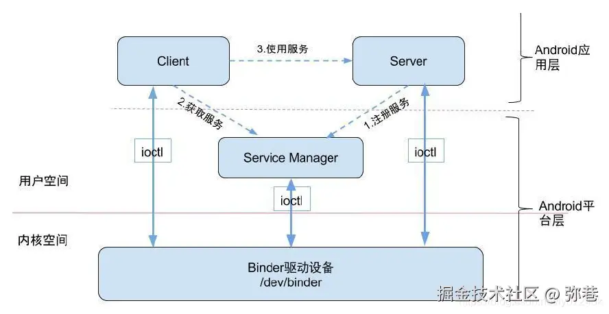 前三者是在用户空间的,也就是彼此之间无法直接进行交互,Binder驱动是属于内核空间的,属于整个通信的核心。