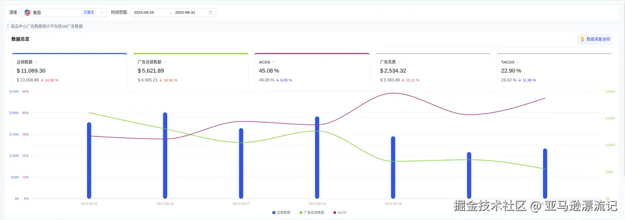 就这么优化了一个多月,7月的数据一下子就好看了:销售额突破一万美元,比之前涨了近三成;ACOS降到54%,TACOS也落到25%——这说明“先砍成本提权重”的路子,真的被A9算法认了。