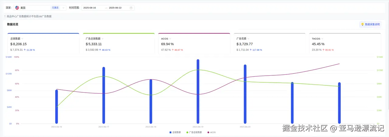 结果呢?忙得脚不沾地,效果却差得离谱。6月中旬那阵,店铺一个月才卖八千多美元,ACOS却飙到75%——也就是说,广告花的钱快赶上销售额了,光广告成本就占了总营收的四成多,这生意根本没法往下干。