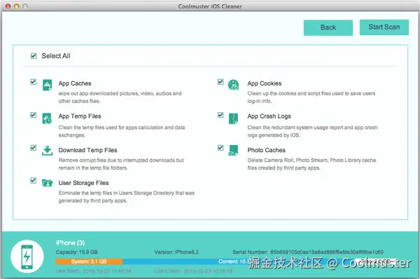 02此时会弹出一个新窗口,显示所有可移除的文件类型,包括应用程序缓存、Cookie、临时文件、崩溃日志、下载的临时文件、照片缓存和用户存储文件。选择要删除的文件类型,然后单击右上角的“开始扫描”按钮。