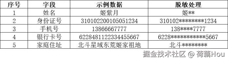 Hive - 数据脱敏 荷藕Hou 2025-12-02 43 阅读1分钟 Part01:背景描述 需要对Hive的数据表中关于用户的个人信息进行脱敏处理。相关字段包括如下几种 姓名 身份证号 手机号 银行卡号 家庭住址 ...... Part02:脱敏规范 如果有不同的脱敏规范,欢迎在评论区交流。 Part03:脱敏语句 姓名 select concat(substr(name,1,1),'**') as name 手机号 select concat(substr(phone_number,1,3),'****', 未完待续...