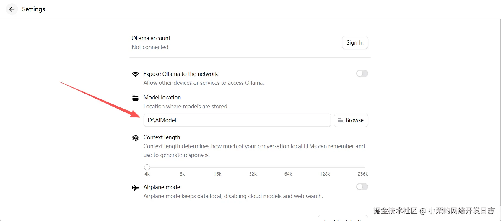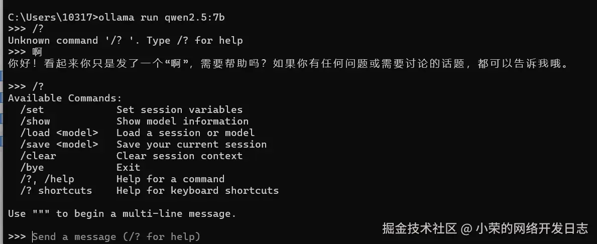 几步搭建本地AI大模型chat聊天(1) 小荣的网络开发日志 2025-12-02 50 阅读1分钟 本片内容基于ollama和librechat开发,最终实现一个CHATGPT的效果。 安装 Ollama ollama.com/download 下载 设置模型安装位置 拉取模型 ollama pull qwen2.5:7b 在本地启动模型 ollama run qwen2.5:7b 使用安装的Ollama