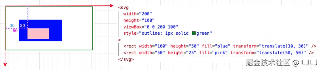 例如上图中,如果粉色rect2以蓝色rect1的为参考坐标系,rect2的左上角坐标应该为(20, 20);如果以用户坐标系作为rect2的参考坐标系,rect2的坐标应为(50,50)。