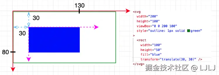 如下图,rect 变换后自身坐标系是蓝色部分,rect的前驱坐标系即svg坐标系(用户坐标系)。