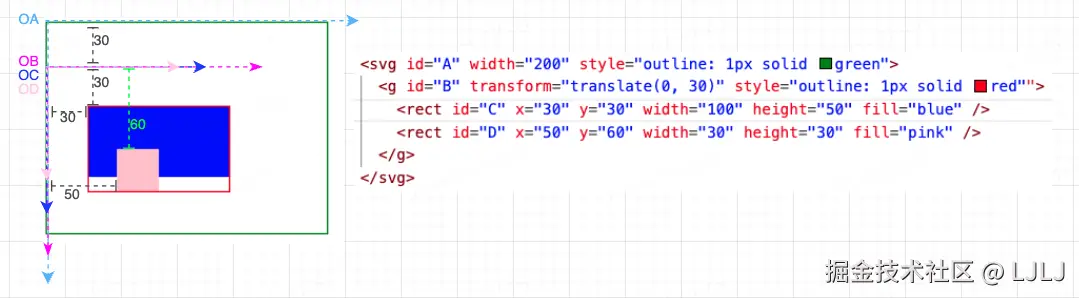还有一个要注意的点是,g标签代表的是元素分组,它本身的作用范围(2个rect外层的红色边框)是由内部元素决定的,但是g的坐标系是OB,是2个不同的概念。