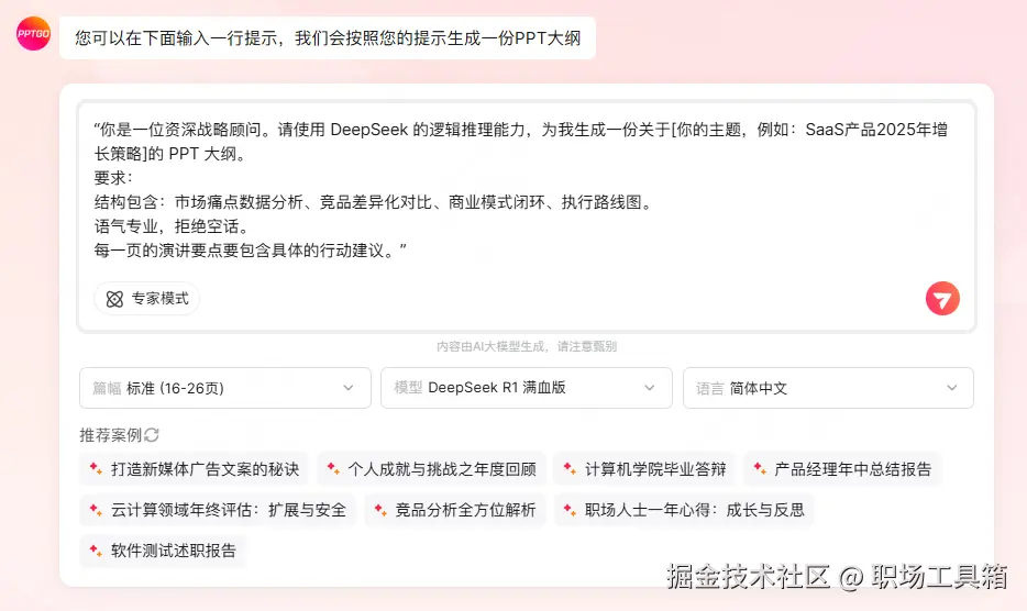 普通模型可能会给你列出“我们要努力增长”,而 DeepSeek 模式下的博思AIPPT会生成“利用 PLG 模式降低 30% 获客成本”的具体策略。