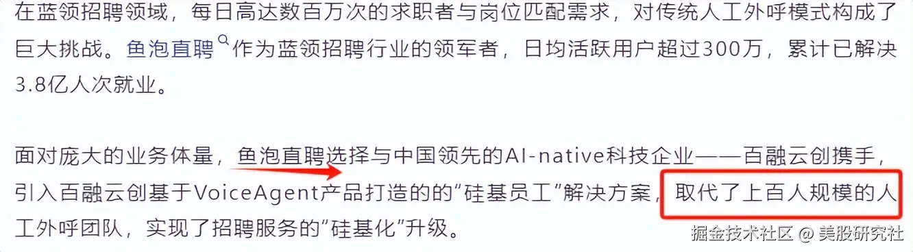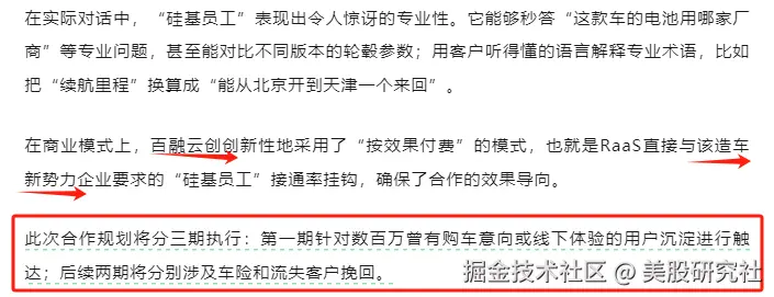 而目前百融云的宣传口径来看:RaaS(以结果计价),并且直接把Voice和Agent平台作为产品与客户签约,说明这两款AI产品已经可以直接为客户解决实际问题。比如银行财富营销场景的多Agent客服转接、招聘平台Voice智能识别企业招聘需求、造车新势力AI挖掘存量用户购车需求等等,直接可以为客户想要达到的结果负责,客户也会因为AI解决的实际效果而付费,而不是此前简单的调用量计价模式。
