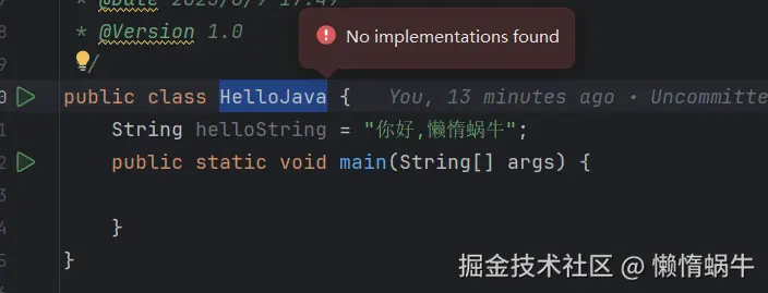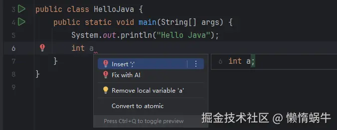 “小黄灯”提示:当代码行左侧出现一个黄色小灯泡图标时,表示IDEA检测到可优化的代码或潜在问题。点击它,会弹出建议列表,例如:“Remove unused import”(移除未使用的导入)