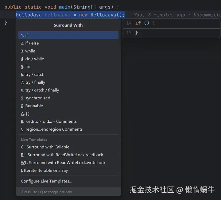 Ctrl + Alt + T 环绕代码块:选中一段代码,按下快捷键,可以选择用try-catch、if-else、for循环等结构将其包围。
