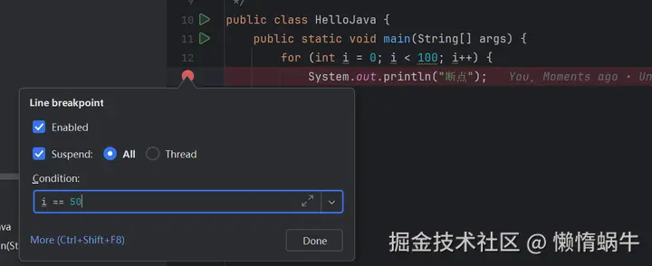条件断点:右键点击断点,选择More或Edit Breakpoint,可以在Condition中设置条件,只有当条件满足时断点才会被触发。