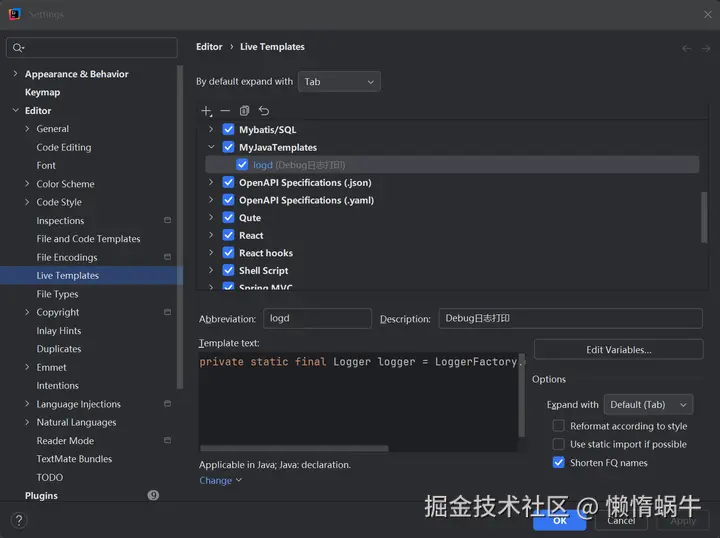 效果就是在编辑区域输入logd然后Tab,就可以快速的生成日志声明。