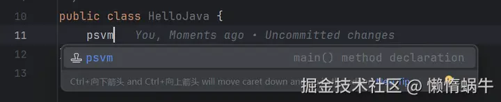 在代码编辑区域输入"psvm",然后按下Tab键,就会直接输出main方法。
