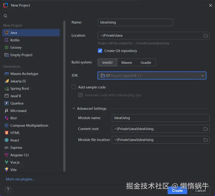 "Build system:"表示构建系统的选择,当前直接选择"Intellij",Maven和Gradle后续会专门写文章讲解。