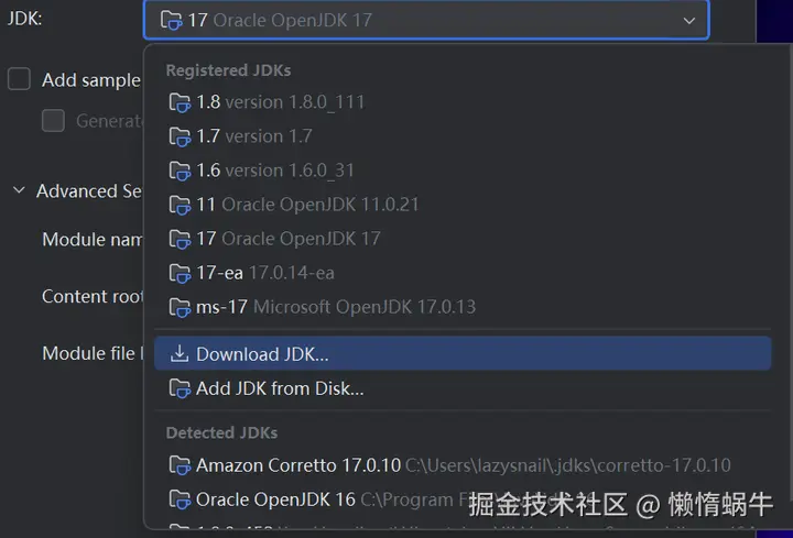 "Add JDK from Disk..."用于你已经在本地开发环境下载了JDK,只需要通过这种方式告诉IDEA,JDK具体的路径就行。