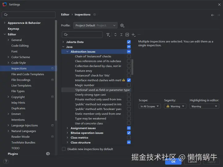 Inspections(检查):File -> Settings/Preferences -> Editor -> Inspections。