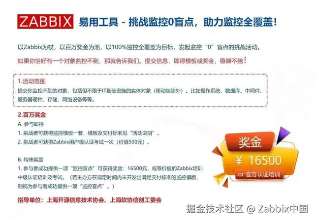 **使用方法:**现有设备无法纳入监控系统,或开发相应模板有困难时,可参与挑战,由Zabbix中国团队诊断并协助开发模板