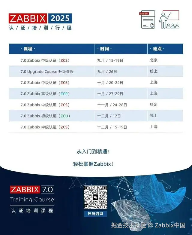 **ZCP(高级认证):**3天系统提升Zabbix应用、使用和配置能力,学习并掌握高级功能,进一步降本增效。适合管理复杂大型、分布式和高负载系统的技术人员,需要一步提升Zabbix应用能力的工程师