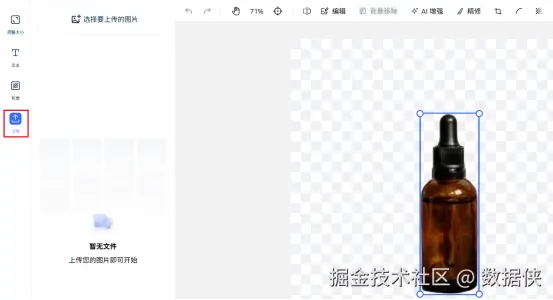 5. 上传和优化: 若需添加更多图片,使用“上传功能”,然后在横排导航条中进行精细调整,如背景移除、裁剪等。