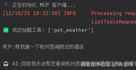 当你运行 mcp_main.py时,你会看见控制台输出了我们预想的完美交互: