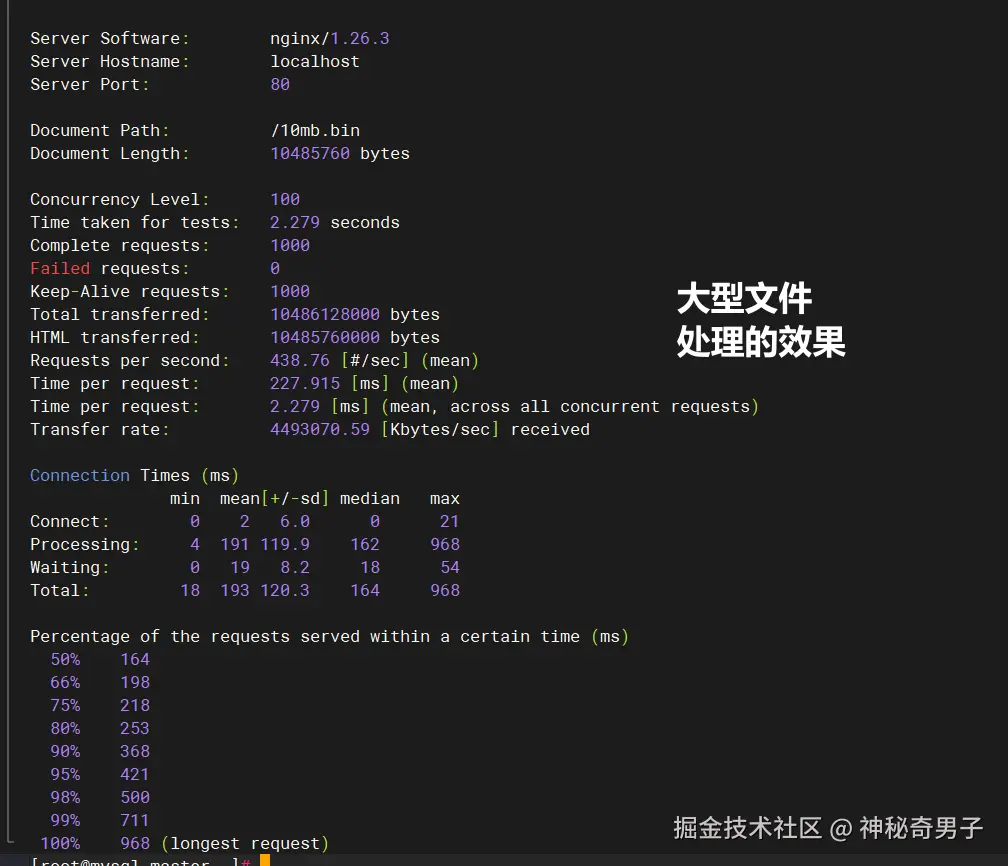 | 10MB 文件 (100并发) | 121/s | 823.4ms | 1345ms | 1.2MB/s |
